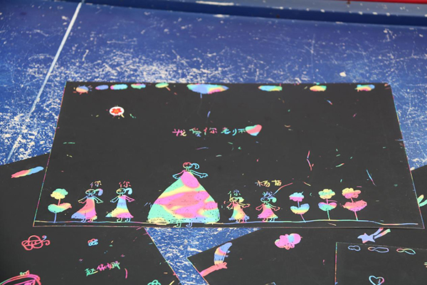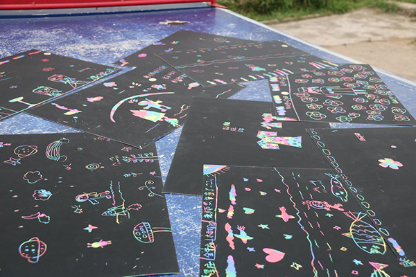 竹签随着孩子们的小手在纸上来回刮划,一幅幅梦想的图画渐渐清晰,你能在他们的眼中看到欢喜,看到向往,看到纯粹和清澈。