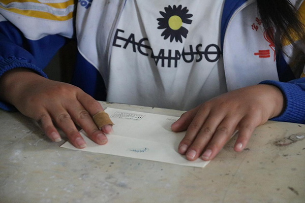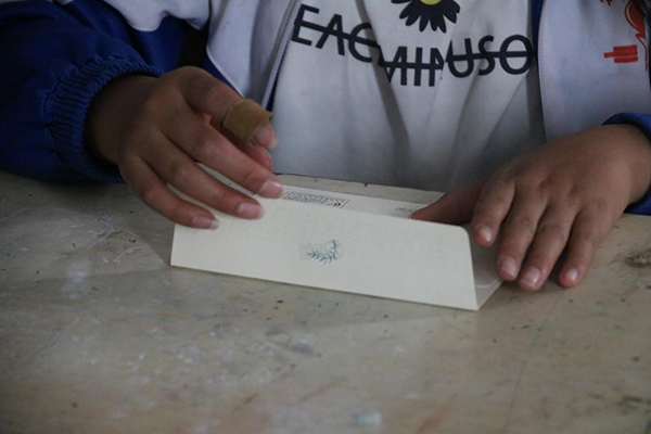 一节课过后,原本空荡的信封已填满了梦想的气息。孩子们将信纸装进信封,用封条粘好。他们的眼神中满是真诚与期待,一张小小的信纸,承载着的是大大的梦想。
