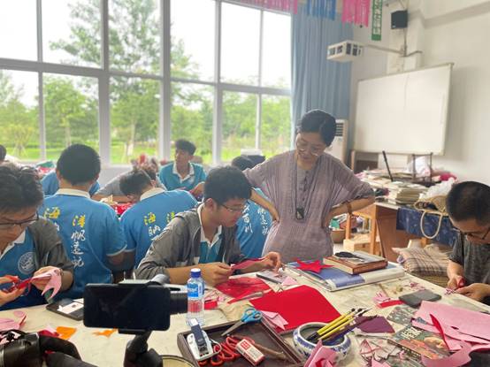 图为老师在指导实践队员们剪纸。中国青年网通讯员 邹佳奇 供图
