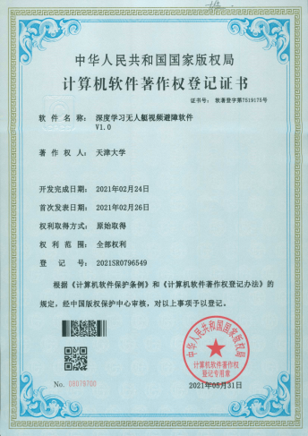 获得《无人艇轻量级水面目标识别系统》和《深度学习无人艇视频避障软件》软件著作权两项,作为主力完成了“海洋精灵-模块化多功能智能水面无人艇”,作品在海洋测绘、海上搜救、河湖长制等多个领域实现业务化应用,受到中国科学院姚建铨院士和国家海洋技术中心罗续业研究员的高度评价,被中央一台《新闻联播》报道。作品获挑战杯国赛一等奖,这是我校目前在“挑战杯”科技发明制作A类赛道取得的最好成绩。