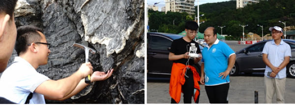 实习第一天,2015级本科生在学院教师的带领下,来到了美丽的海滨城市大连。在大连滨海国家地质公园,学生们亲身感受、观察认识了海蚀崖、海蚀柱、海蚀拱桥等典型海蚀地貌,学习分析海岸地质构造变化。在大连山体公园练习航空测量,学生们在专业老师的指导下亲自操控了无人机,感受到测量的严谨与精确。在交通运输部北海航海保障中心大连航标处棉花岛航标养护中心,实习小组学习使用RTK测量仪器,尝试绘制草图,完成海岸地形测量,水准测量和潮汐观测等实习内容。