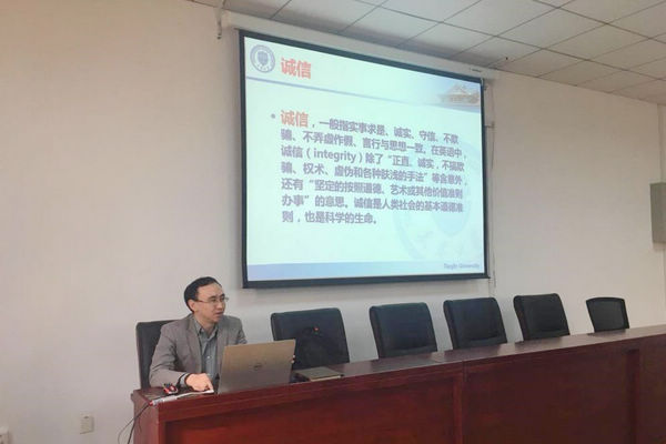 巩乐首先由大学之道的含义作为引言,指出大学培养的是德才兼备的人才,尤其是作为研究生,属于未来科研队伍的主力军,更应该把实事求是作为科研的核心和实质,把成为道德高尚,学术严谨作为科研目标。做一个热爱民族、热爱国家、追求真理、崇尚科学、既有知识、又有能力、既有学问、又有道德的科研人。