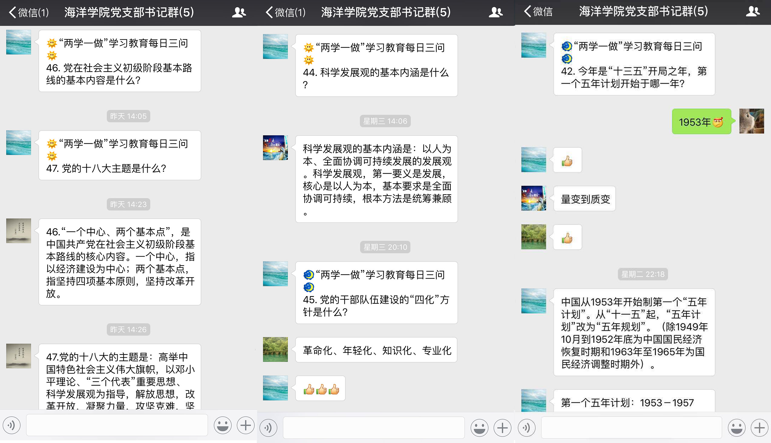 截至目前,该活动已经开展了20余天,得到了学院全体党员的积极支持和参与,学习氛围热烈,效果良好。学院师生党员和入党积极分子普遍反映,已经将抢答“三问”问题变成了一种习惯,每次看到问题后以最快速度回答,碰到拿不准或担心表述不到位的问题,及时通过手机上网搜索或翻阅学习资料确定正确答案后迅速答题,这样对知识的记忆和理解格外深刻,学习效果非常明显。而且,利用大家最为随身和常用的手机微信作为学习平台,真正做到了随时、随地学习。学院将会继续坚持开展此项活动,并积极探索其他有益形式,保证学习教育的日常性、参与性、互动性,将“两学一做”学习教育推向深入。