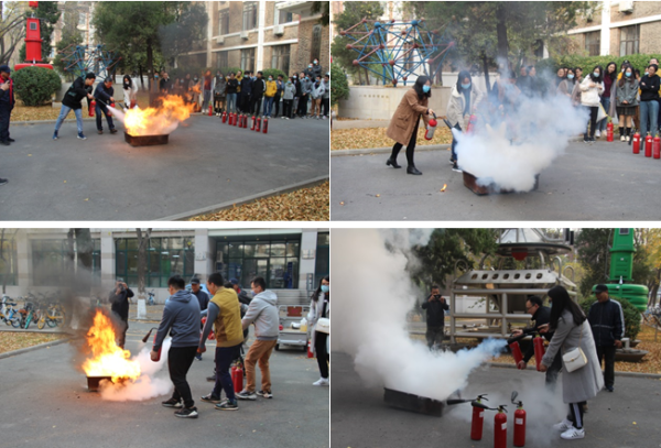 巩乐强调了消防演练的重要性,并对保卫处的大力支持表示感谢。他指出,此次消防灭火演练是学院安全应急能力建设的重要内容,号召全院师生积极参与到消防安全工作中,形成安全工作群防群治的局面。保卫处防火科陈庆丰老师讲解了灭火器的使用方法和注意事项,并亲自示范。在认真听讲及观摩后,师生们亲自体验了现场灭火的过程。面对熊熊燃烧的火盆,师生们表现的十分沉着,按照陈老师的讲解要点和灭火器的使用步骤将浓烟大火成功地迅速扑灭,做到了冷静面对突发情况,成功快速扑灭火情的消防标准。