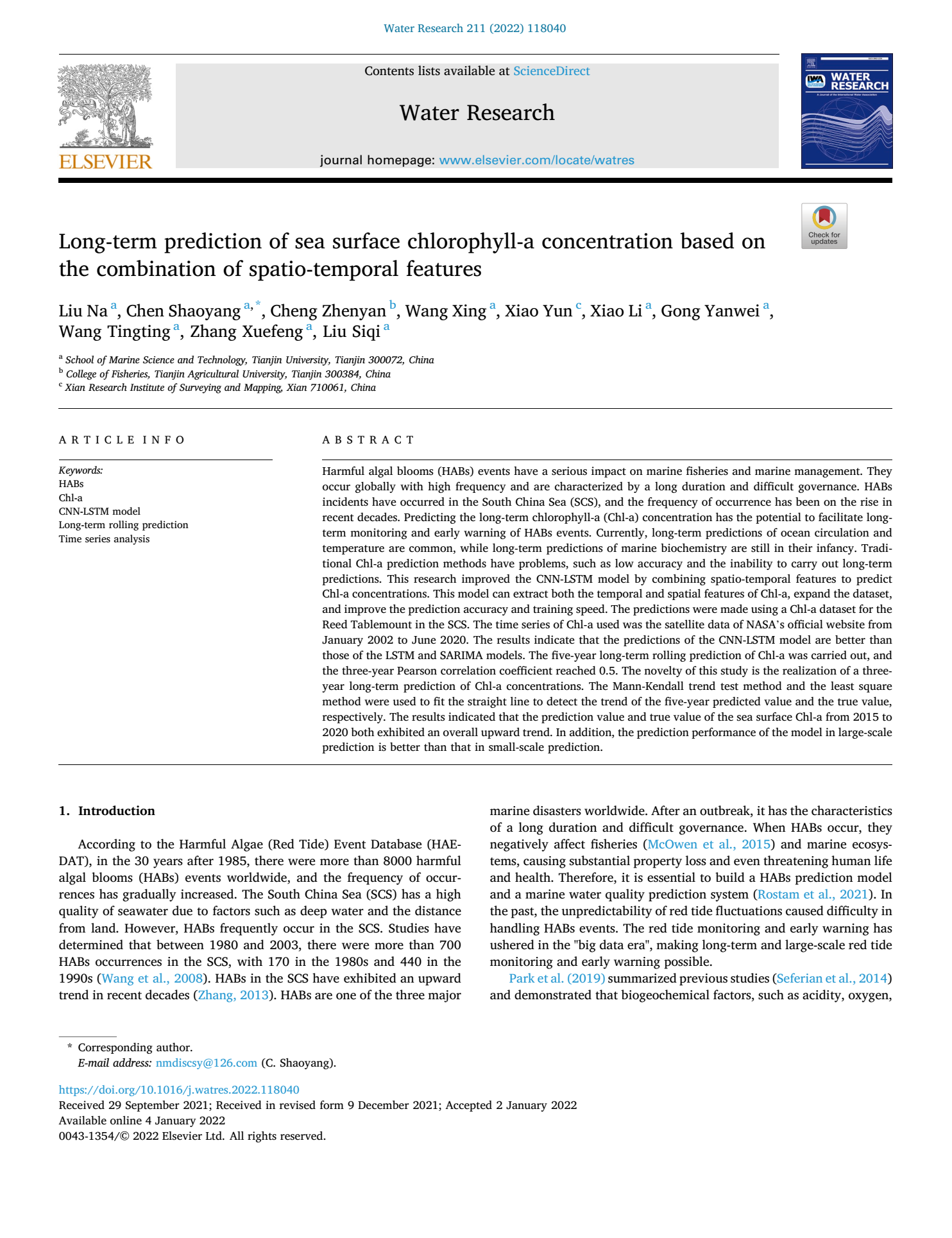 日前,国产自拍 师生在海洋环境要素长期预测方向取得重要研究成果,通过改进一种结合时空特征的CNN-LSTM深度学习模型预测chlor_a(叶绿素a)的浓度变化,解决了传统的chlor_a预测方法精度低、不能长期预测等问题,能够为有害藻华事件的长期监测和预警提供技术支撑,体现了海洋管理与海洋技术的深度学科融合。该研究成果以论文形式发表于自然指数统计源期刊Water Research(影响因子11.236),题为:Long-term prediction of sea surface chlorophyll-a concentration based on the combination of spatio-temporal features。国产自拍 硕士研究生刘娜为论文的第一作者,陈韶阳副教授为通讯作者。
