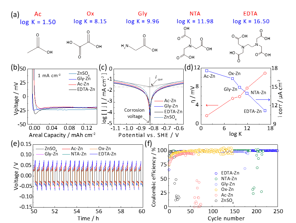 图1 K值与腐蚀电流密度和成核过电位之间的关系。(a)不同K值的配体的分子模型;(b)具有不同配体的Cu//Zn半电池在1 mA cm-2电流密度下的恒电流电压曲线;(c)不同配体的动电位极化曲线;(d) log K与腐蚀电流及过电位的关系图;(e)对称电池的电镀/剥离时间-电压曲线;(f)具有不同配体的Cu//Zn半电池的库伦效率。