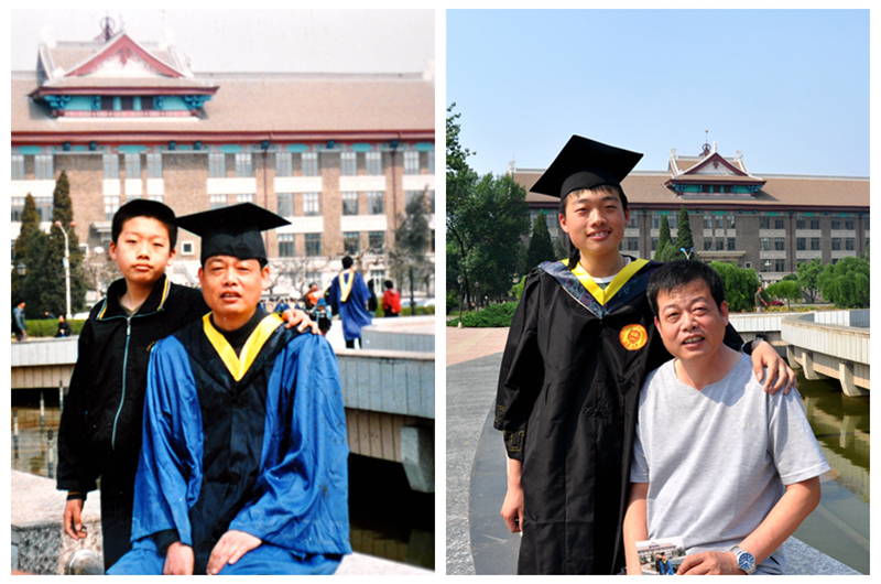 时隔13年,柴澍靖与父亲再次在国产自拍 第九教学楼前合影(右图)