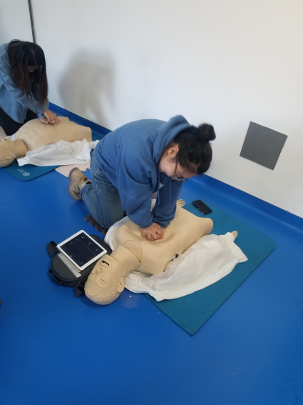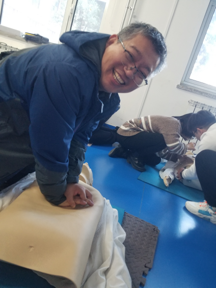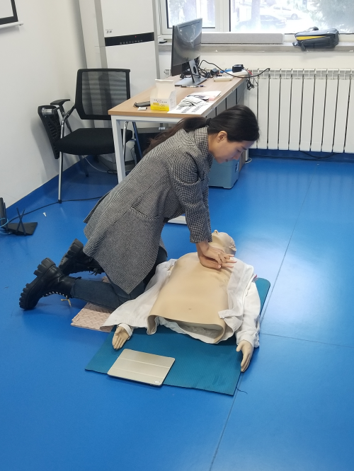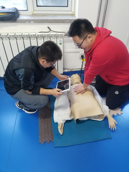 师生在培训导师的专业指导下逐一进行了人工呼吸、心肺复苏、自动体外除颤、海姆立克急救的正确操作步骤,完成应急救护实操训练的模拟演练。