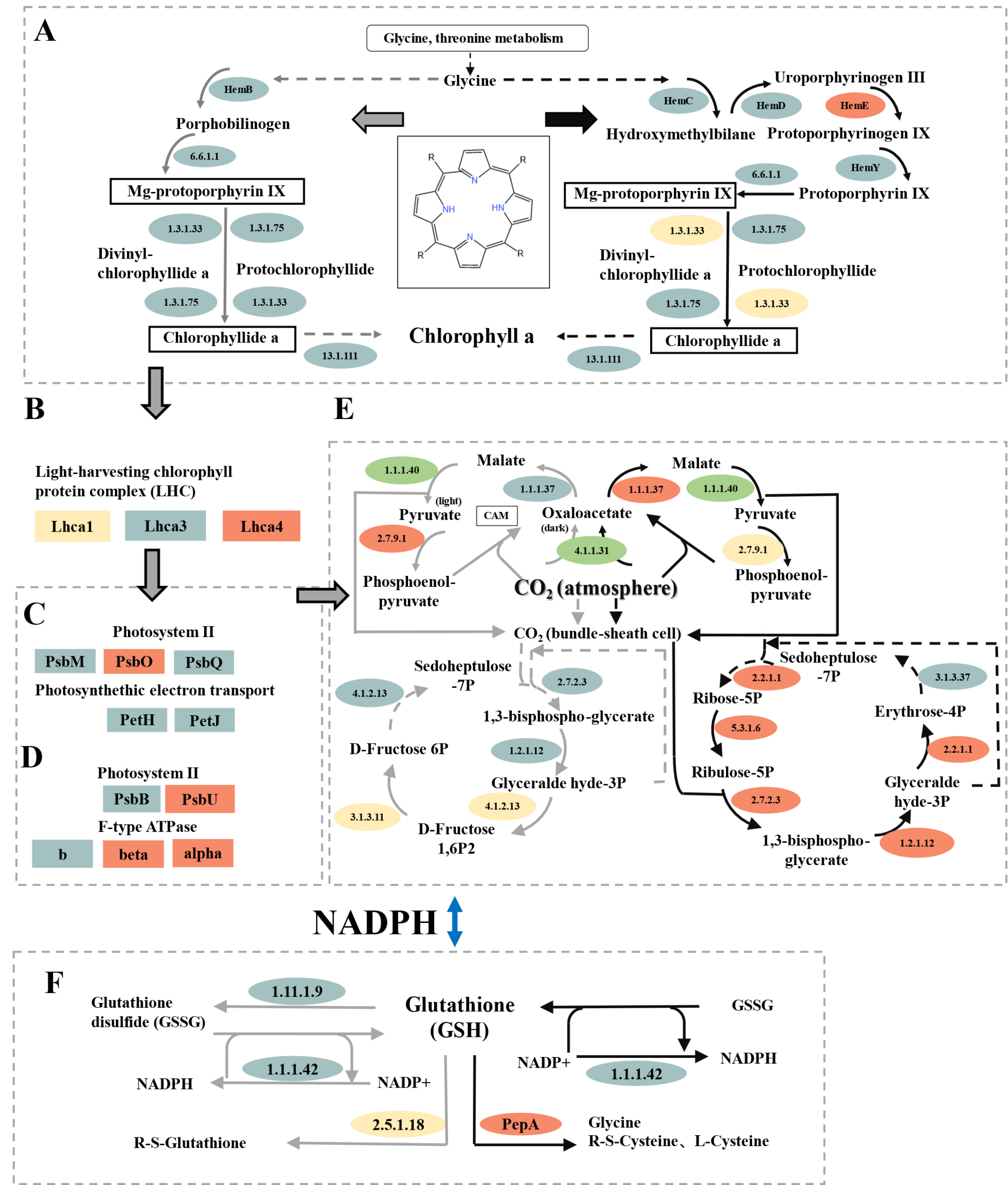 2.卟啉代谢(A)、光合作用(B - E)和谷胱甘肽代谢(F)通路图。粉红色代表上调的基因。绿色表示没有变化的表达基因。亮蓝色代表下调的基因。橙色代表同时上调和下调的基因。蓝色箭头代表抑制效应。