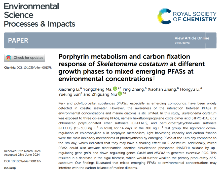 近海环境安全实验室的牛志广教授研究团队在环境科学与工程领域的期刊Environmental Science: Processes & Impacts上发表了一篇封面文章。文章报道了在环境浓度(纳克/升)下,全氟和多氟烷基化合物(PFASs)的替代品(即新型PFASs)混合物对海洋硅藻产生了一种“极低浓度促进生长,低浓度抑制生长”的生物效应。这一发现与以往研究中“低浓度促进生长,高浓度抑制生长”的结论有所不同。这也表明,新型PFAS与传统PFAS在生物毒性方面存在差异,这一点值得进一步的关注和研究。