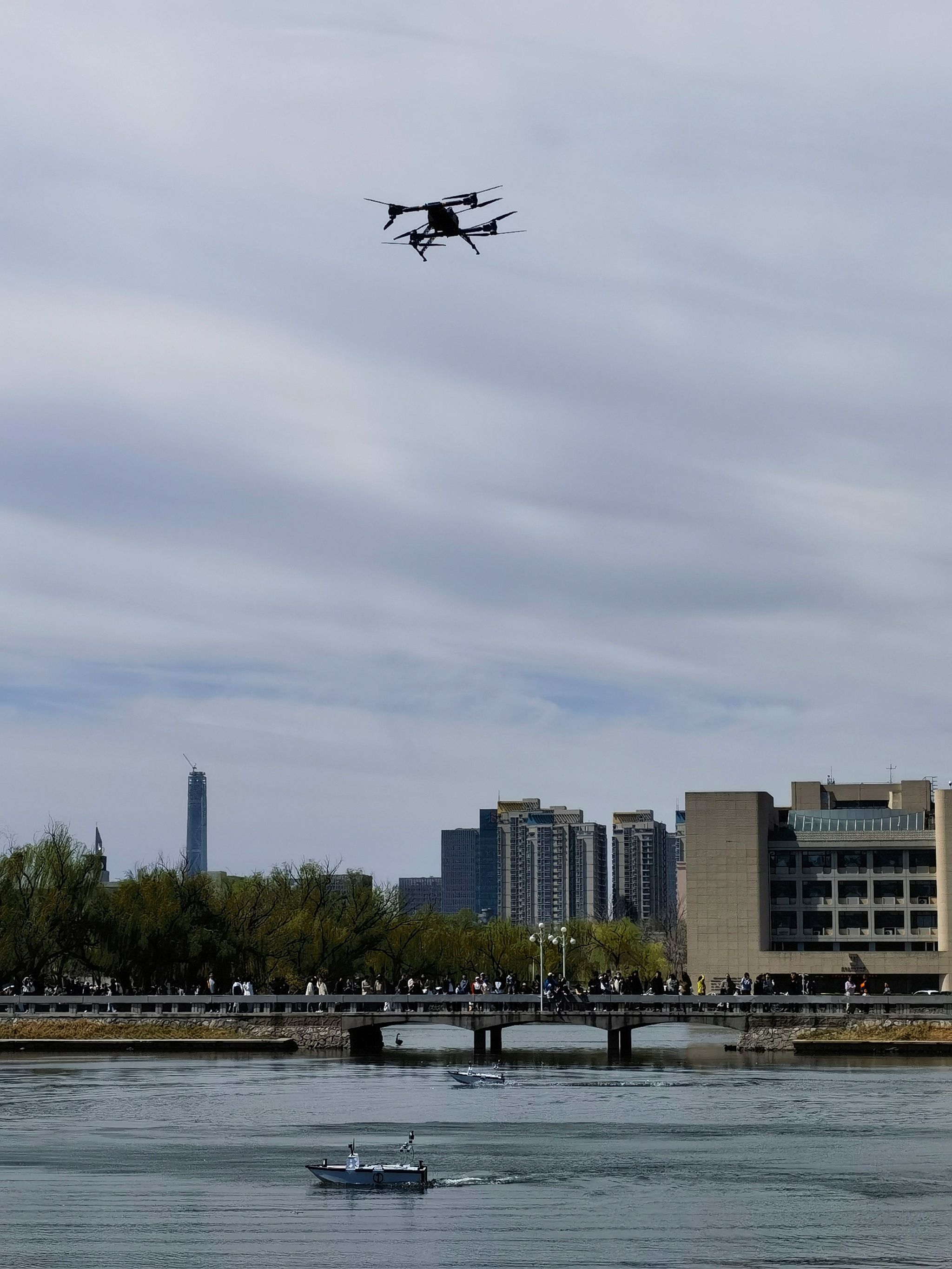 在湖光春色中,无人机展翅飞行翱翔,无人艇乘风破浪,划出一道优美的弧线,令来往游客叹为观止,纷纷驻足围观,感受海洋科学与技术的奇妙魅力。