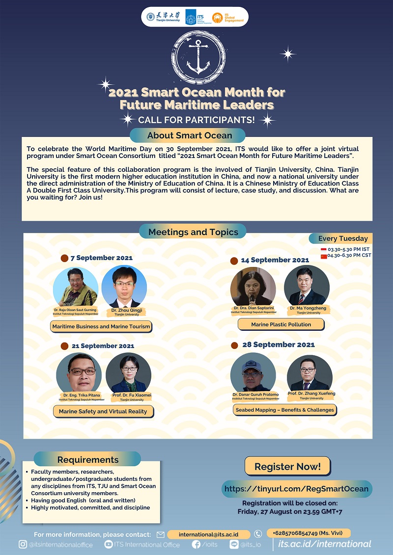 | 2021.09.14 16:30-18:30(GMT+8); 14:30-16:30(GMT+7) | Marine Plastic Pollution | Dr. Dian Saptarini (ITS) Dr. Yongzheng Ma (TJU) |