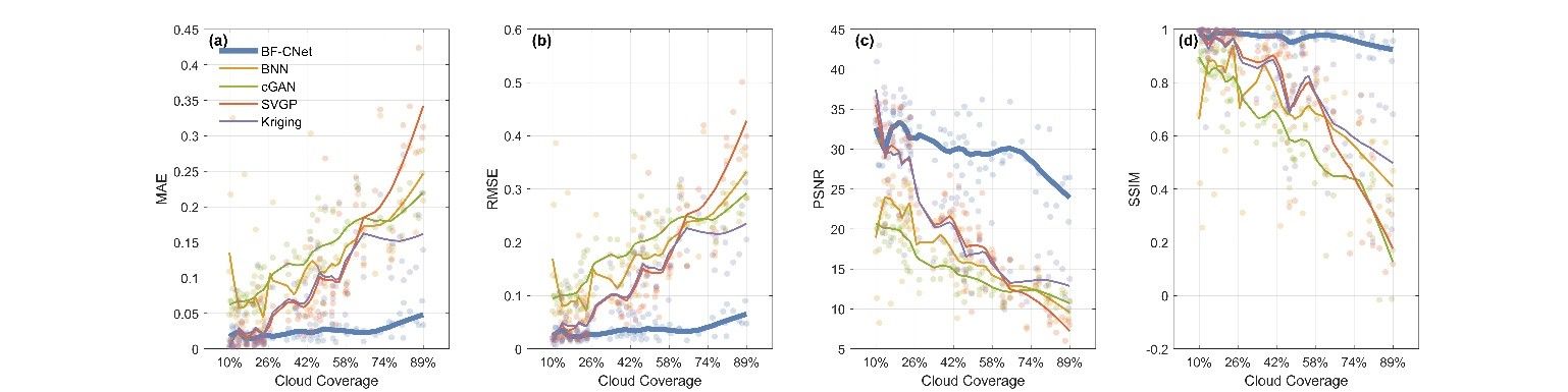 图 3. 在不同云覆盖水平下,BF-CNet 与基线方法(BNN、cGAN、SVGP 和 Kriging)的定量性能比较。子图分别展示 (a) MAE、(b) RMSE、(c) PSNR 和 (d) SSIM 的变化情况。彩色散点表示单次测试结果,实线表示各云覆盖水平下的平均变化趋势,其中 BF-CNet 以蓝色曲线突出标示。