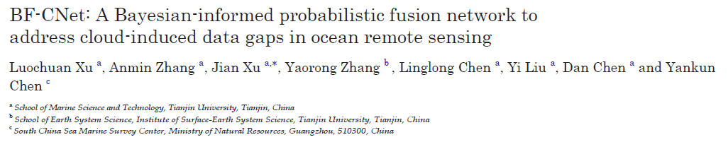 该研究成果发表于地球科学领域1区TOP期刊《International Journal of Applied Earth Observation and Geoinformation》(CiteScore=13.5),题为:BF-CNet: A Bayesian-informed probabilistic fusion network to address cloud-induced data gaps in ocean remote sensing。2024级博士研究生许洛川为第一作者,导师张安民研究员为第二作者,徐剑副教授为第三作者并担任通讯作者。