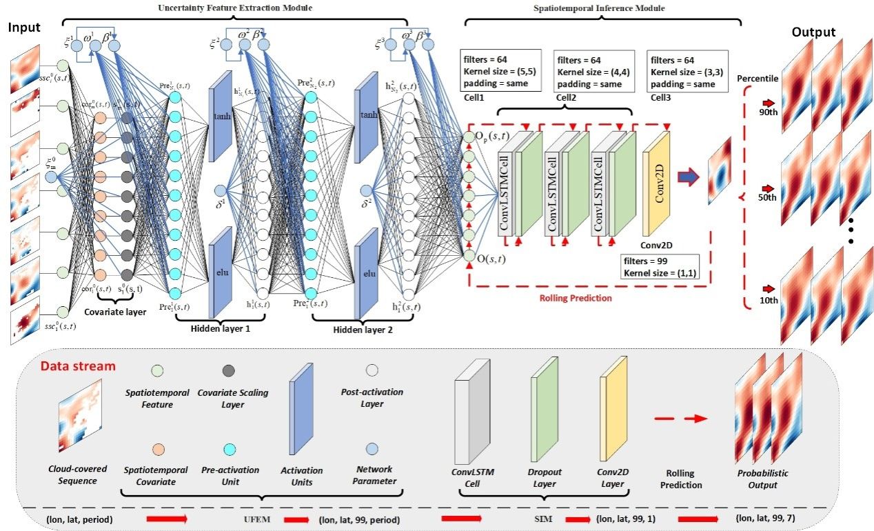 为解决这一问题,课题组提出了一种全新的贝叶斯概率融合深度学习框架BF-CNet。该模型能够在大面积云覆盖条件下,对缺失的海洋遥感数据进行高精度重建,并同时提供像素级不确定性评估,为结果的可靠性提供明确量化支撑。BF-CNet 综合利用空间结构信息与时间演变特征,不仅可以有效恢复云下缺测区域的数据,还能够实现对未来短期变化的预测,显著提升了海洋遥感数据的完整性和连续性。