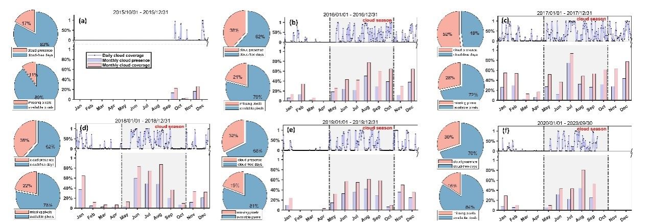 图 1. 研究海域云覆盖的时间变化特征。图(a–f) 展示了多年的云覆盖动态变化。上层为每日平均云覆盖情况,下层为每月平均云覆盖情况。下层图中,蓝柱表示该月的多云天数占比,粉柱表示该月云覆盖像素的平均比例。左上角的饼状图展示全年多云天数的占比,左下角的饼图展示全年因云层遮挡导致数据损失的比例。虚线及其阴影部分标示了“云季”,对应云量高发、云区范围广的时段。